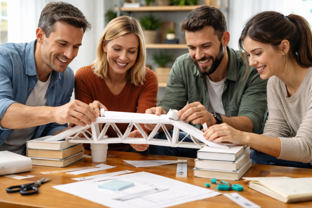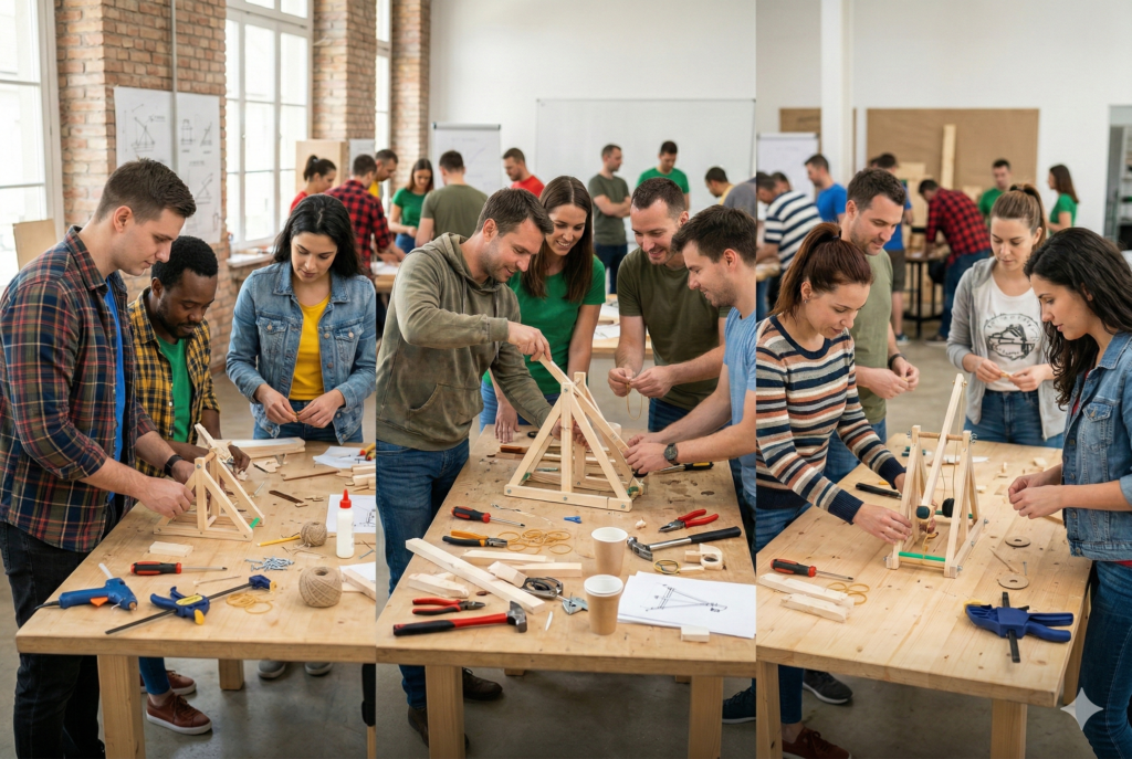 A feladatok a kreatív gondolkodást, az innovatív szemléletet és a strukturált együttműködést fejlesztik. Ideális, ha a cél a csapat kreatív energiáinak feloldása vagy a közös ötletelési kultúra fejlesztése.